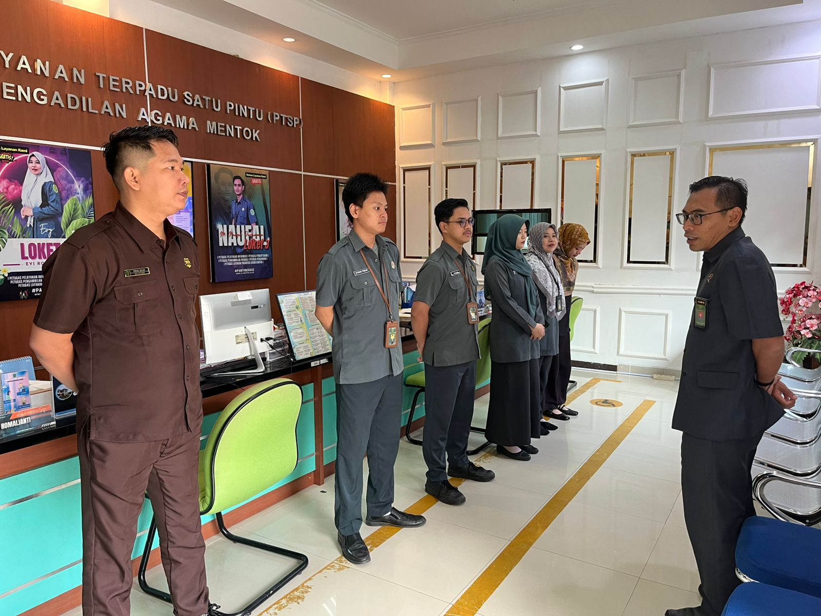 www.pa.mentok.go.id. Mentok, 7 April 2026 – Dalam rangka meningkatkan kualitas pelayanan serta menciptakan lingkungan kerja yang profesional, Pengadilan Agama Mentok menggelar briefing pagi yang diikuti oleh seluruh petugas PTSP, Petugas Keamanan, dan Posbakum. Kegiatan ini menjadi sarana penyampaian arahan pimpinan terkait pentingnya menjaga kerapian ruang Pelayanan Terpadu Satu Pintu (PTSP) serta membangun komunikasi yang efektif dengan atasan.Kegiatandilaksanakan di ruang PTSP ini dipimpin langsung oleh Hakim Pengadilan Agama Mentok, Bapak Iman Herlambang Syafruddin, S.H.I., M.H.
