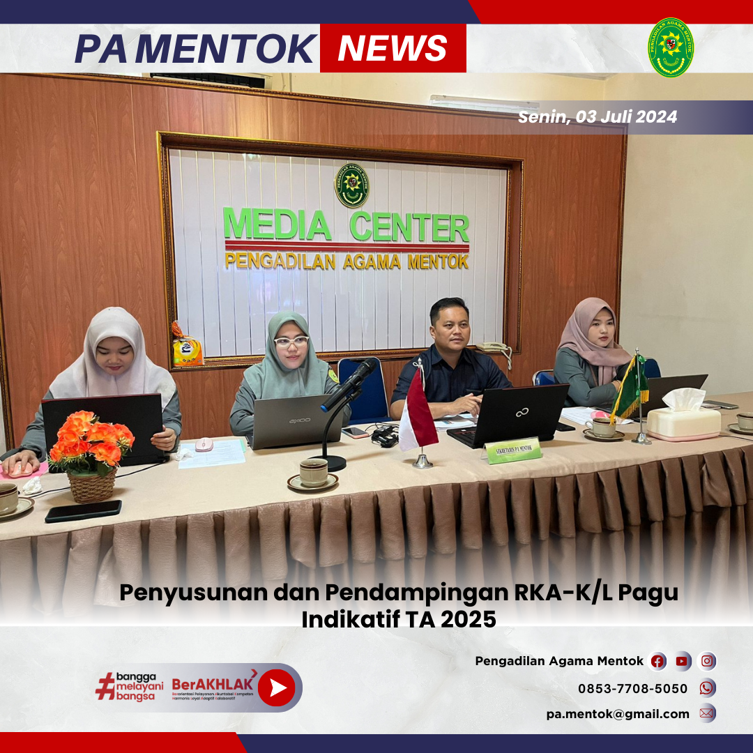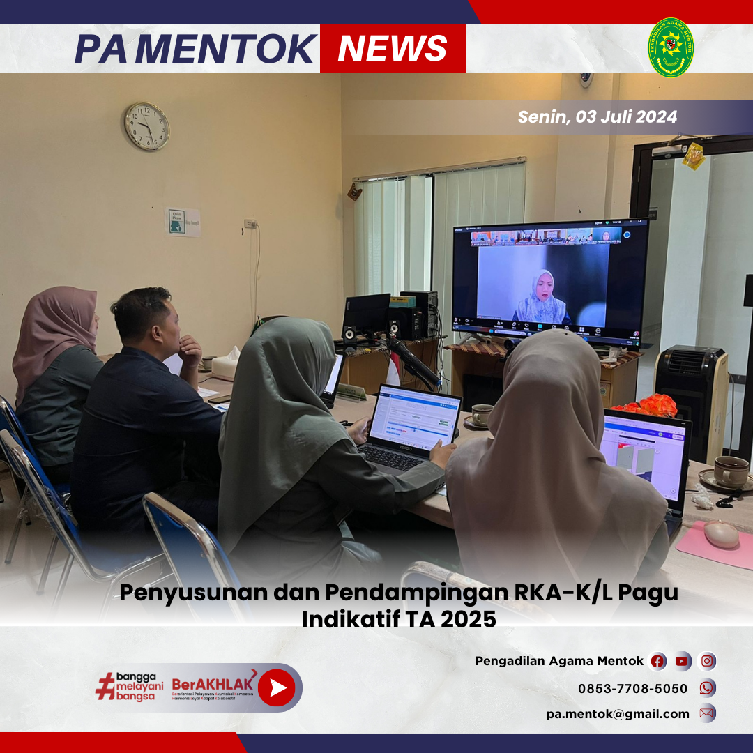 www.pa-mentok.go.id. Rabu 03 Juli 2024. Sekretaris Pengadilan Agama Mentok Ian Herkartadi, S.Kom, serta Operator Sakti dan Operator BMN Pengadilan Agama Mentok mengikuti Kegiatan Pendampingan dan Penelahaan RKA-K/L Tahun 2025 untuk wilayah PTA BABEL yang berlangsung secara daring melalui zoom meeting pada pukul 08.30 wib hingga 12.00 wib. bertempat di ruang Media Center Pengadilan Agama Mentok.
